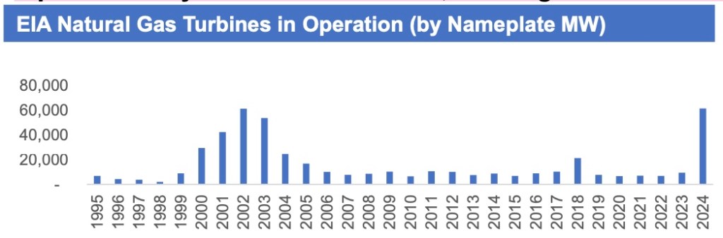 Current EIA data shows the significant 500%+ jump in natural gas turbines in 2024, reflecting the prior peak in 2002, as the power grid became strained in the U.S., partly due to the rise of the internet. Gas turbines have an asset life of between 20-30 years, so assets will begin to be retired