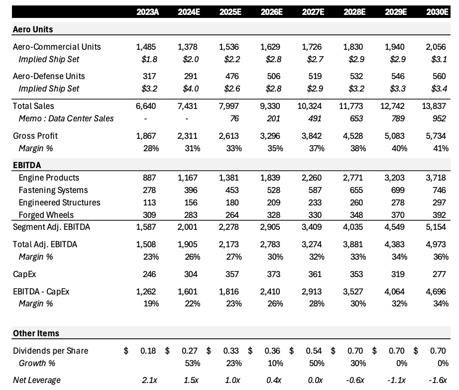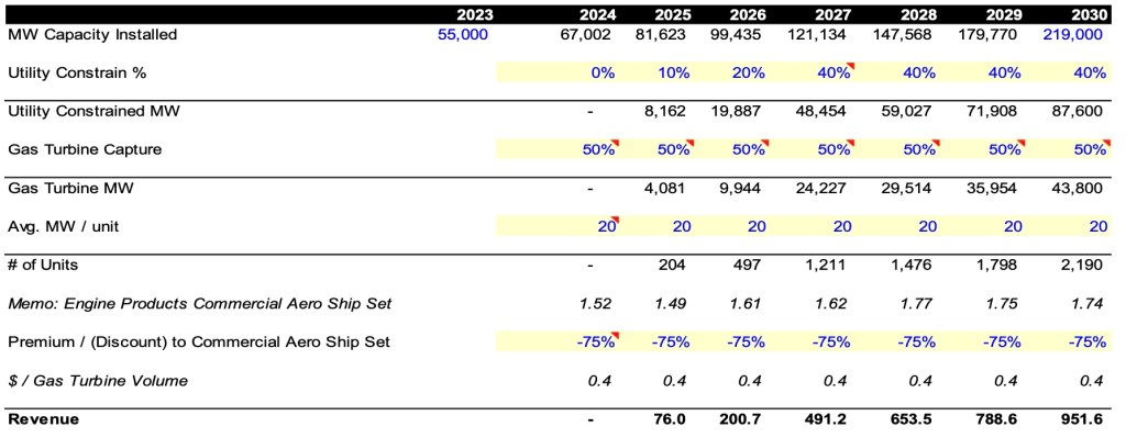 The model below isolates the impact to aeroderivative turbines for behind the meter data center applications and potential implied chipsets for Howmet
