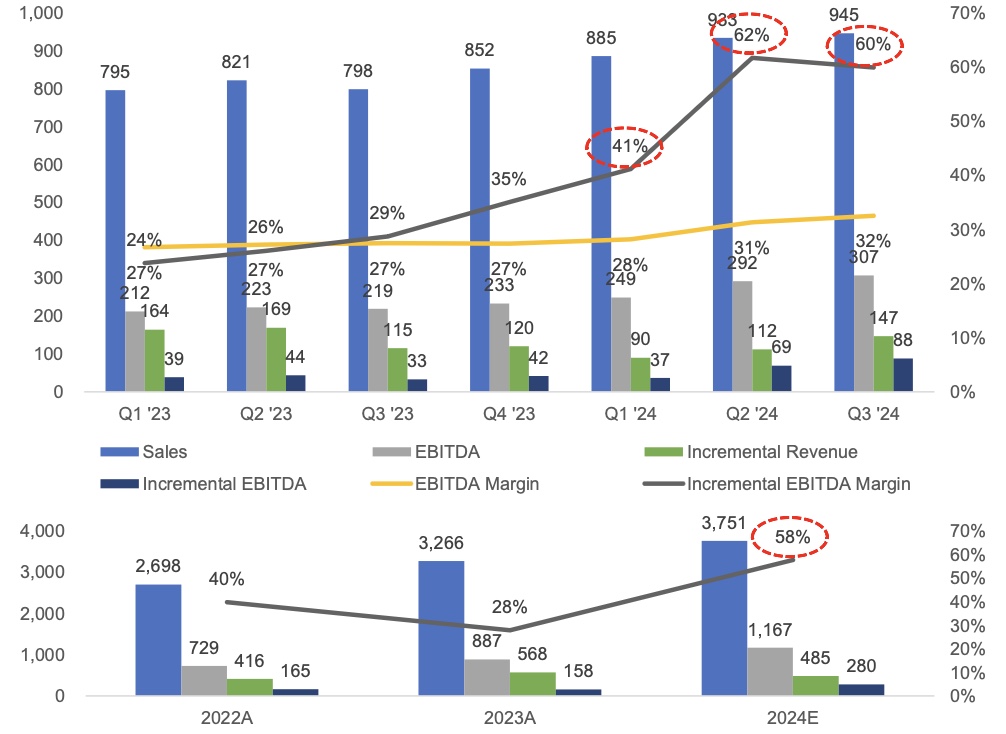 - Incremental margins have increased steadily over the past year, and assuming consensus margins in Q4, would generated EBITDA margins of ~58% for 2024E