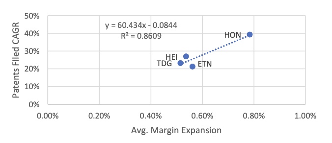 When looking at correlation of margin expansion and patent filing for key comps that also are levered to aerospace & defense, the R2 is 0.86 and implied margin expansion based on HWM’s patent filing is 30bps+; indicating expansion vs. contraction