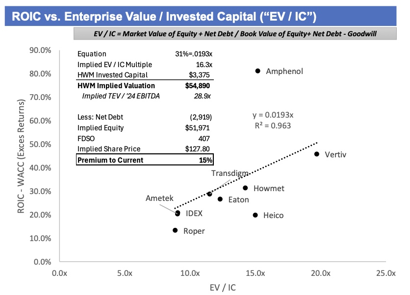 ROIC and invested capital have a high correlation across top industrial compounders (R2 = .963) and implies a premium of 15% on HWM’s current valuation. As HWM continues to drive outsized topline growth and expand margins in line with the likes of HEI (ie. 2027E breaking into upper 20s EBITDA margin), investors will underwrite a similar long term cash flow profile.