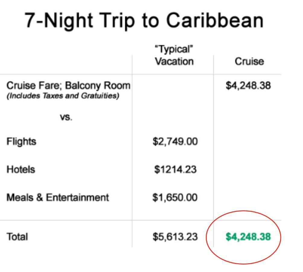 In an analysis done for a 7-night vacation to the Caribbean for a family of 3, a cruise would approximately be ~24% cheaper