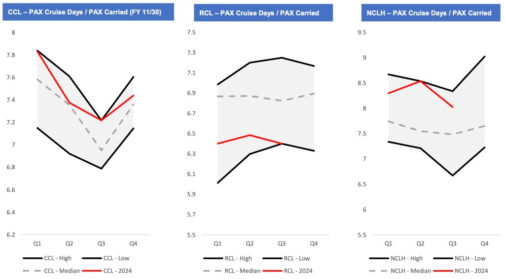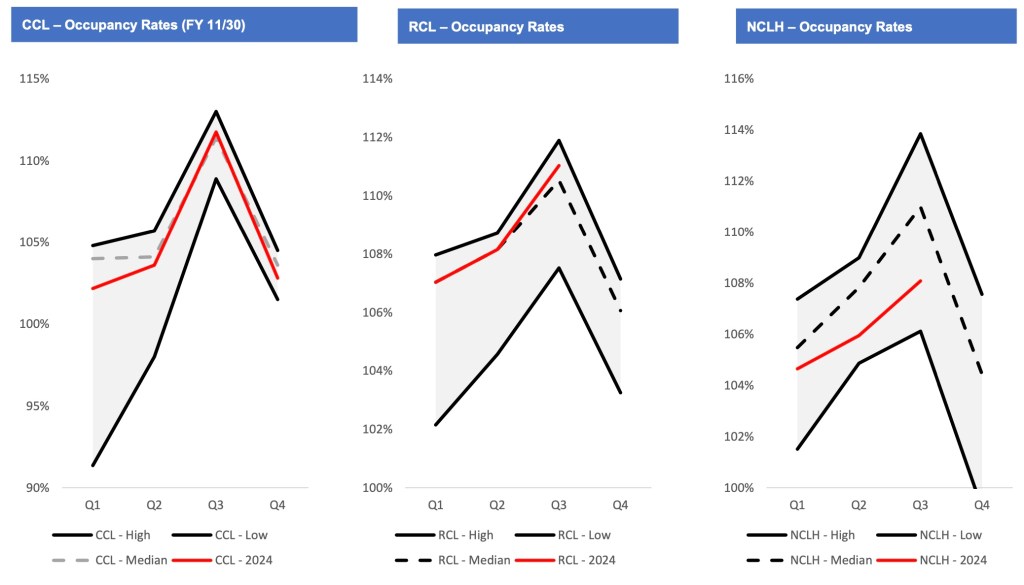 CCL and RCL have demonstrated high occupancy rates above historical medians while NCLH has lagged in 2024